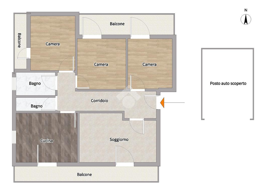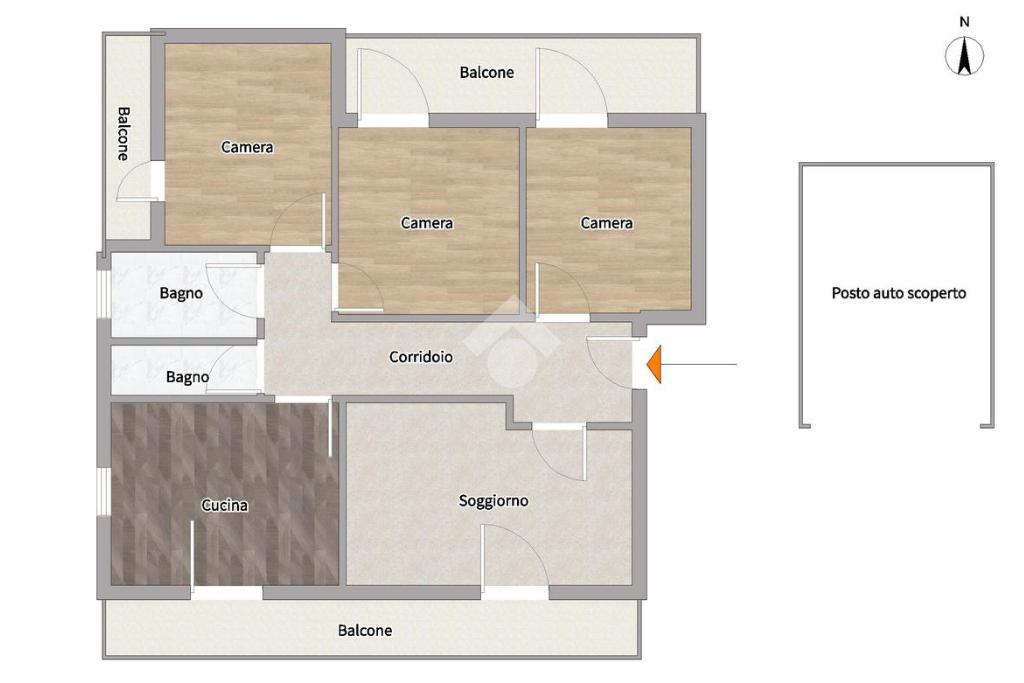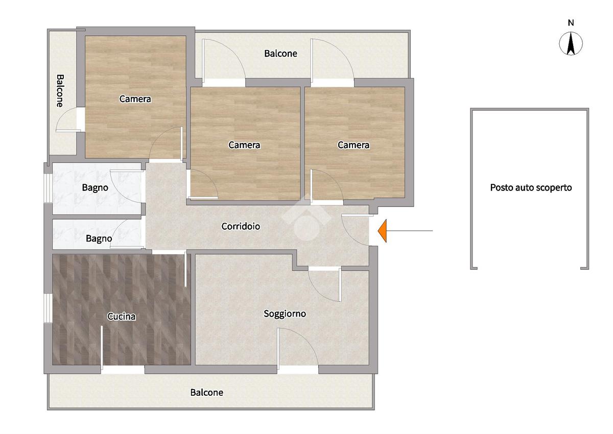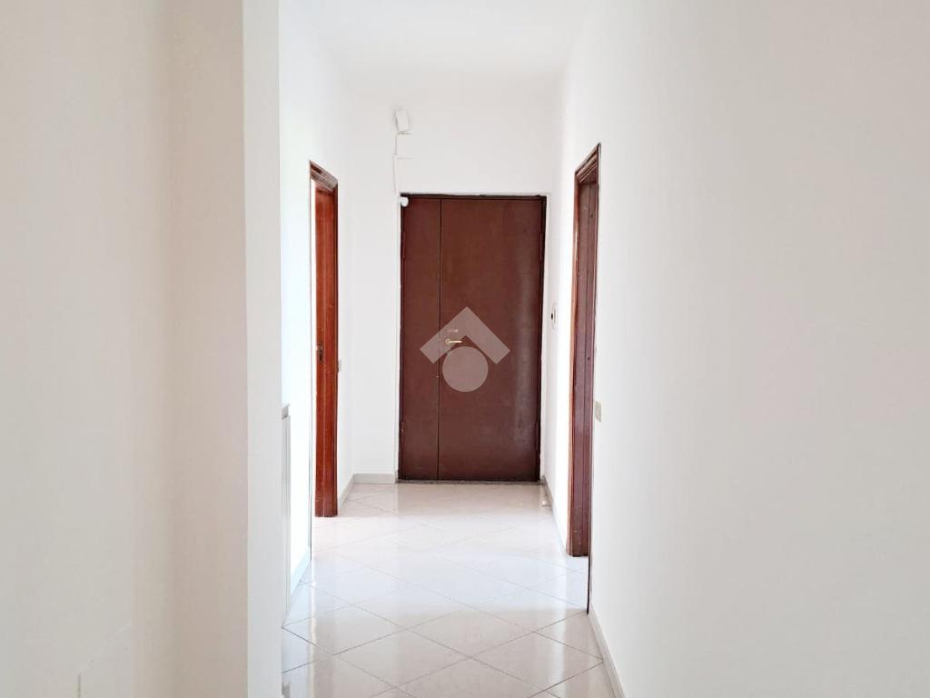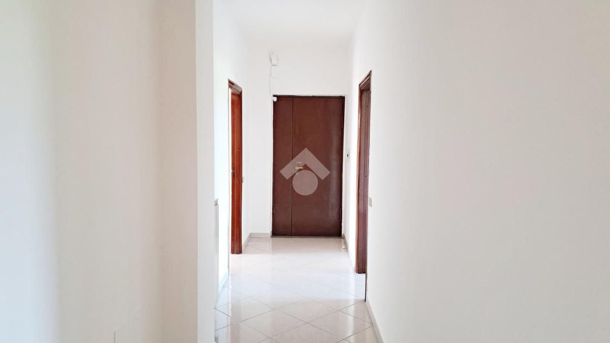 L'appartamento, di 111 mq interni, è così composto : dall'ingresso si dirama il corridoio alla cui sinistra sono ampio soggiorno e cucina che affacciano sul balcone esposto ad ovest, a destra due camere da letto che affacciano su un ampio balcone terrazzato esposto a est mentre in fondo vi sono due bagni e una quarta camera dotata di un ulteriore balcone esposto a nord.