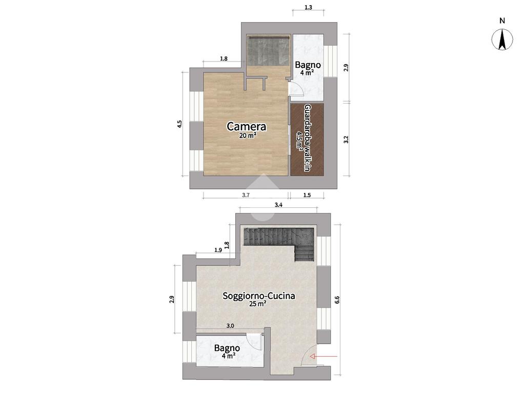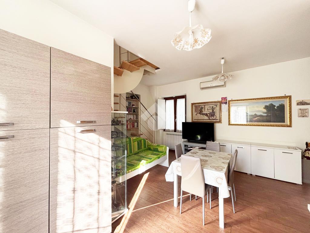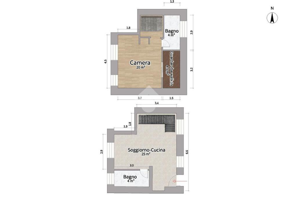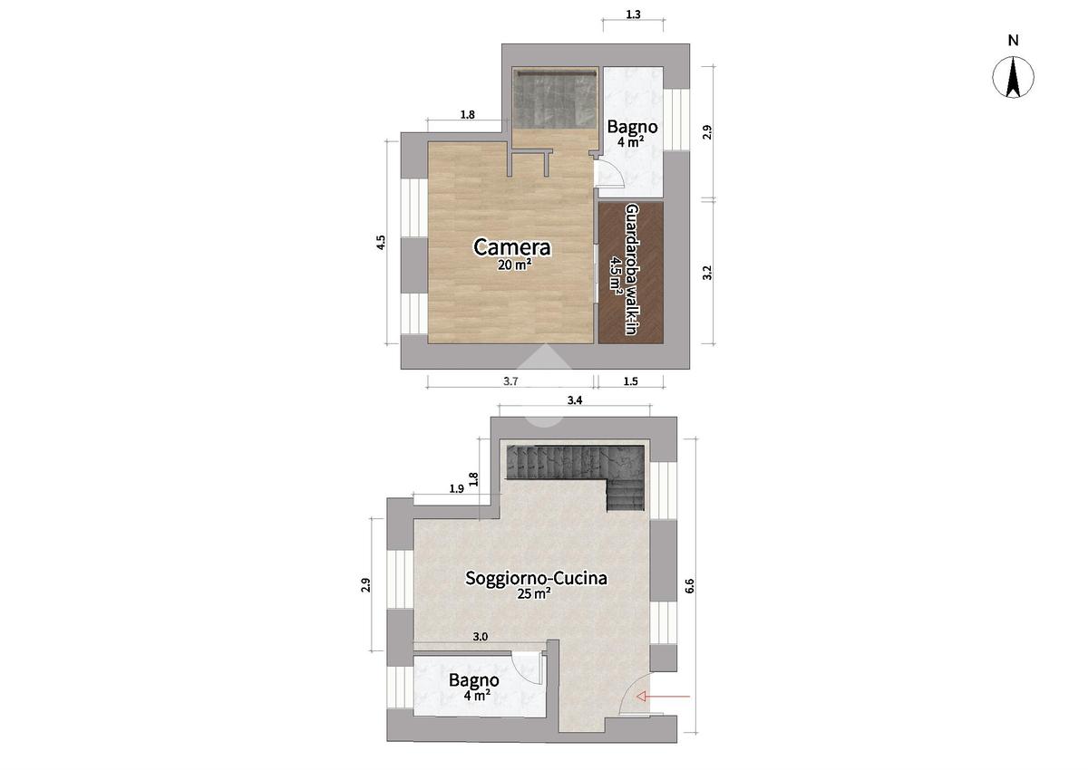 L'immobile, di 55 mq interni, è cosi composto: ingresso al piano terra che immette nel soggiorno cucina con due finestre, bagno con doccia anch'esso con finestra; tramite scala a vista accediamo al piano superiore dove troviamo camera da letto con cabina armadio e secondo bagno.