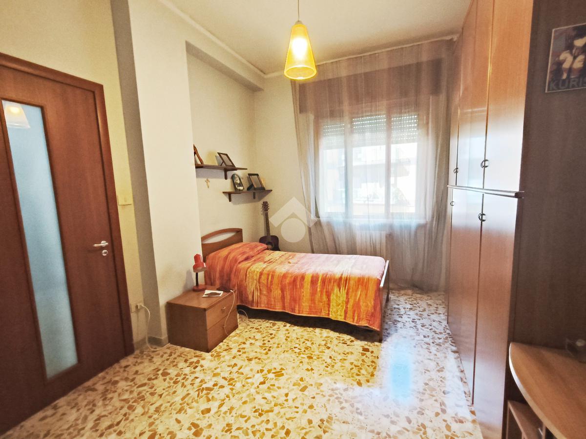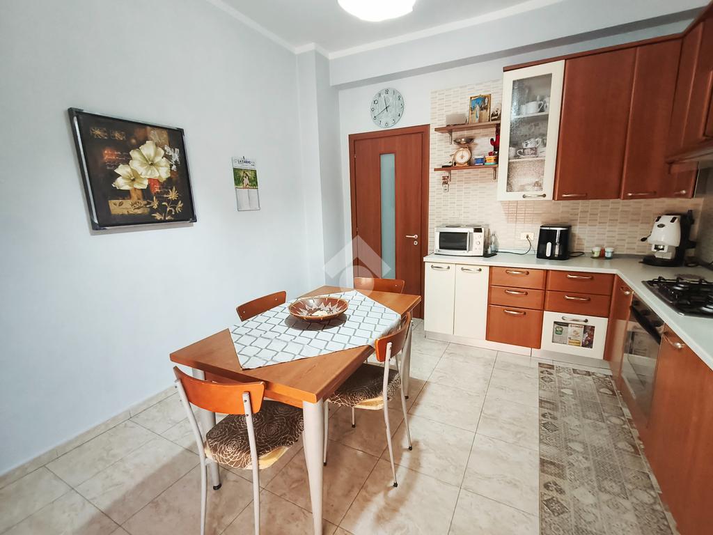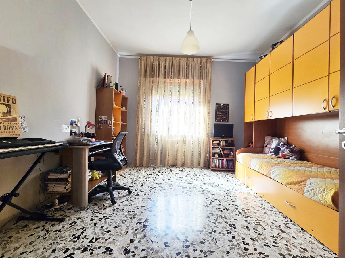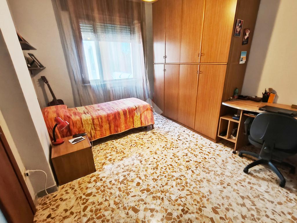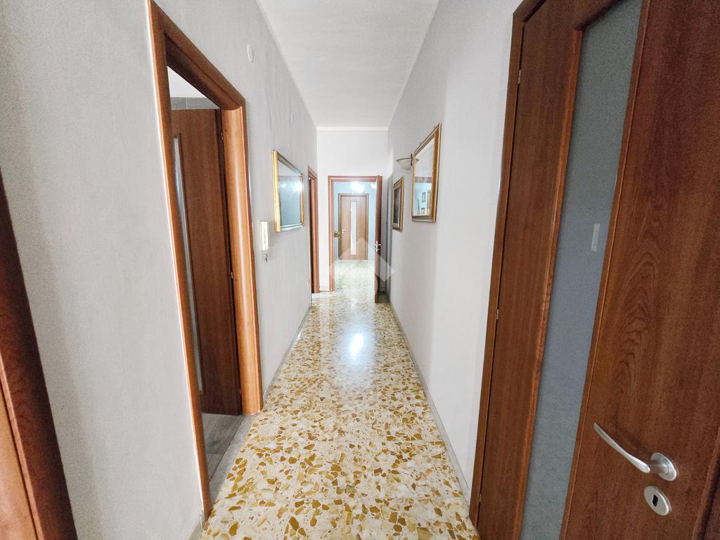L’immobile, di 122 mq interni, situato al primo piano con ascensore, si presenta con un ampio disimpegno d’ingresso che conduce ad una prima camera da letto, un luminoso soggiorno, cucina abitabile e due bagni, uno con doccia e l’altro con vasca. La zona notte ospita un'ulteriore cameretta, una camera da letto matrimoniale e il ripostiglio.