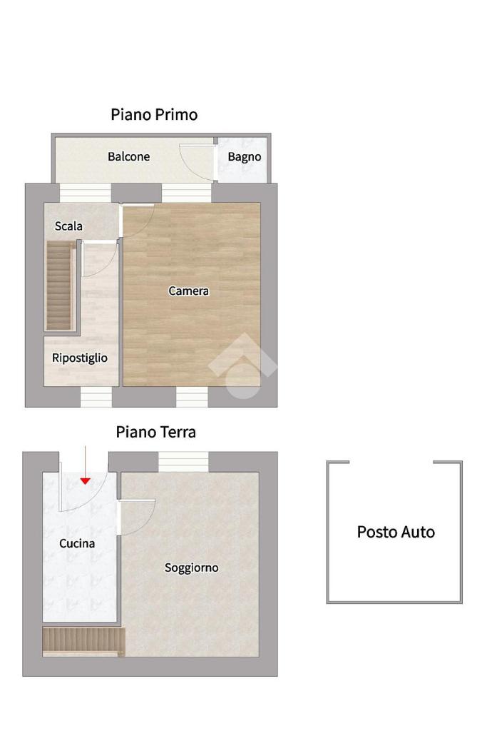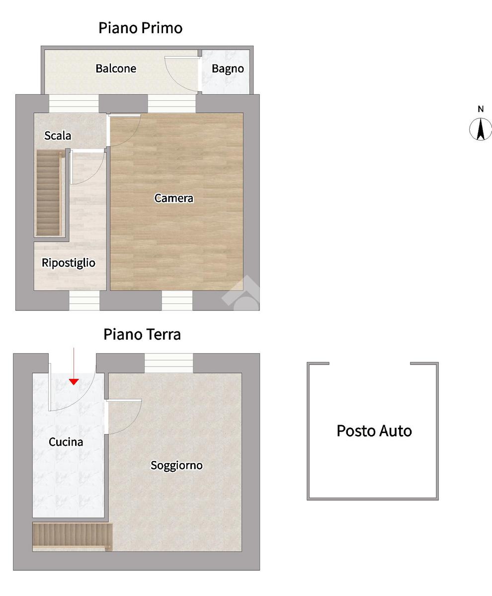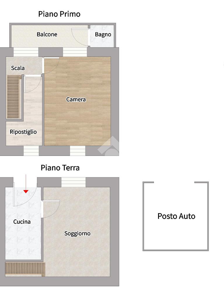 L’immobile, di 55 mq interni, si sviluppa su due livelli: il piano terra composto da cucina, soggiorno e scala di collegamento tra i livelli; al primo piano troviamo camera da letto, ripostiglio, bagno e balcone.